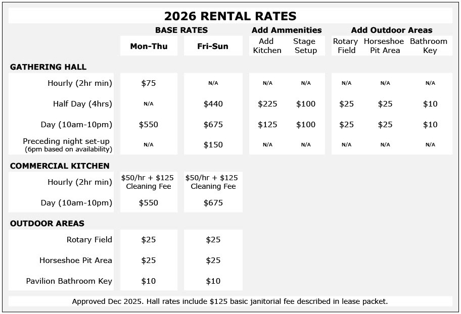 - Hall and/or Commercial Kitchen Rentals require a $500.00 security/cleaning deposit.